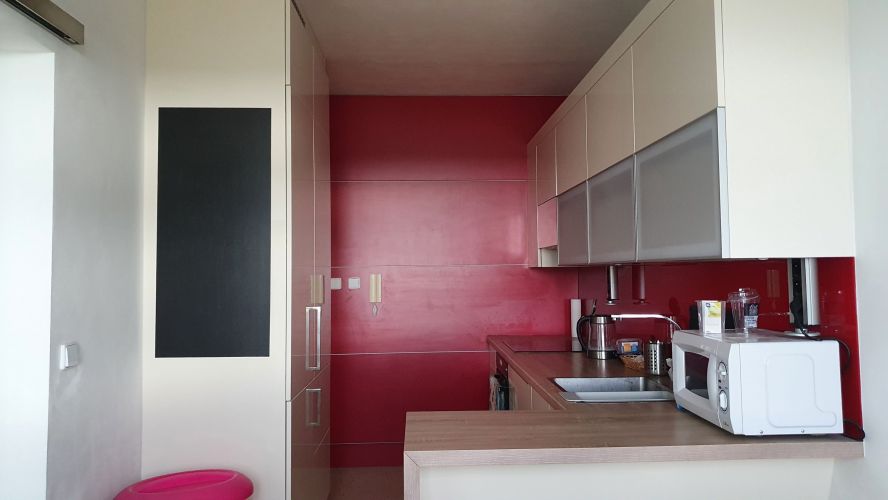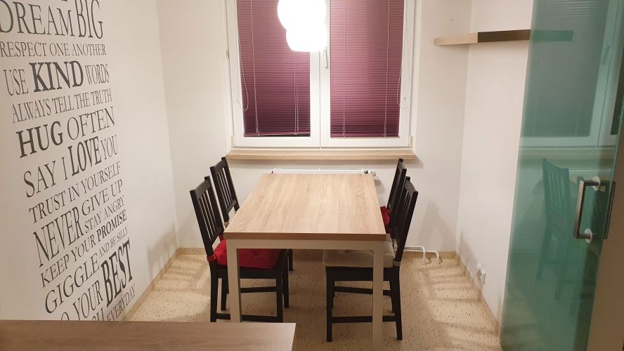 V bytě se nachází velký společný obývací pokoj, plně vybavená kuchyň s jídelnou - lednička, mikrovlnka, indukční varná deska, trouba, rychlovarná konvice, myčka.