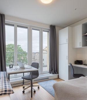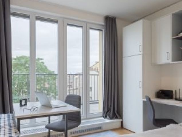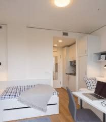 It is a shared room for girls on the 7th floor. There is small kitchen in the room and bathroom. There is laundry room in residence and should be paid per usage.