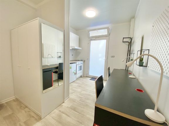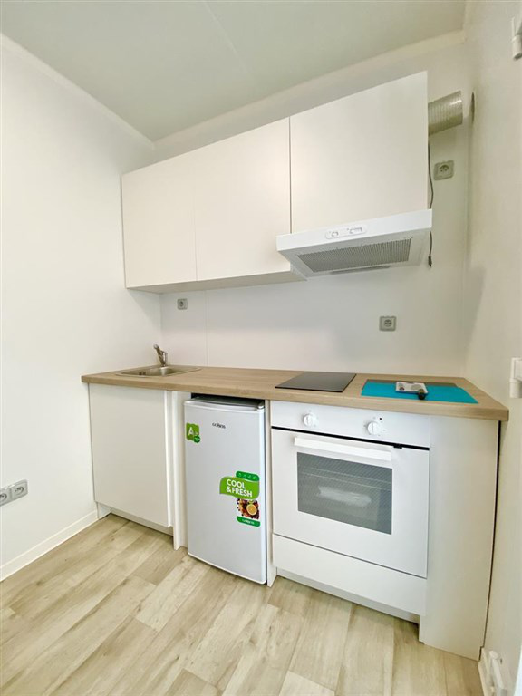 Jedná se o pronájem moderní bytové jednotky o dispozici 1+kk, která je kompletně vybavená. Součástí vybavení kuchyně je plně zařízený kuchyňský kout, včetně lednice, mikrovlnné trouby, varné konvice, sklokeramické desky, digestoře a dřezu. Jednotka je vybavena dvěma pohodlnými postelemi s nočními stolky, dvěma pracovními stoly se židlemi a dostatečným prostorem na ukládání oblečení. Koupelna je také plně vybavená, a to sprchovým koutem, záchodem a umyvadlem. K dispozici je příprava pro připojení vlastní pračky.