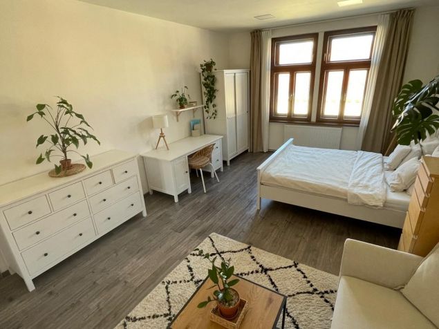 Ahoj:) Nabízím k pronájmu prostorný pokoj s vysokými stropy o velikosti 24 m2 ve zrekonstruovaném bytě na ulici Bezručova, v rozšířeném centru Brna s výhledem na Petrov. Byt se nachází 150 m od zastávky Hybešova (tramvaj 1, 2) a 200 m od zastávky Křídlovická (tramvaj 8, 12). Byt je 5. patře cihlového domu s výtahem. Jedná se o studentský byt 3+1 s příjemnou atmosférou, kde v dalších dvou pokojích bydlí celkem tři studenti. Pokoj je určen pro dvě osoby, v případě zájmu je možné odkoupit aktuální vybavení nebo jeho část, měsíční nájemné na osobu je 6 000 Kč + 1 000 Kč záloha na služby (za pokoj celkem tedy 12 000 Kč + 2 000 Kč zálohy na služby) . Kauce je 12 000 Kč. Možnost nastěhování k 1. 9. 2024 (po domluvě možné i dříve). Byt je vhodný pro někoho, kdo ocení spíše klid a čistotu a nehledá úplně párty byt. Pro více info, sjednání prohlídky pište na (majitele kontaktuj pomocí kontaktního formuláře dole na stránce). Preferujeme nekuřáka, bez mazlíčků.