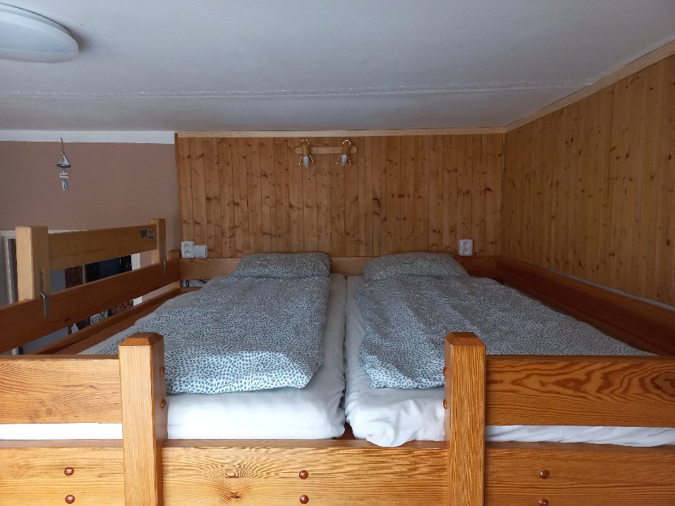 Na fotografiích je byt připraven pro pár. V případě potřeby se místo jídelního stolu umístí pod mezonet postel a noční stolek, vzniknout tak dvě plnohodnotná místa pro spaní.