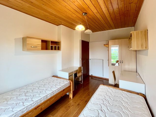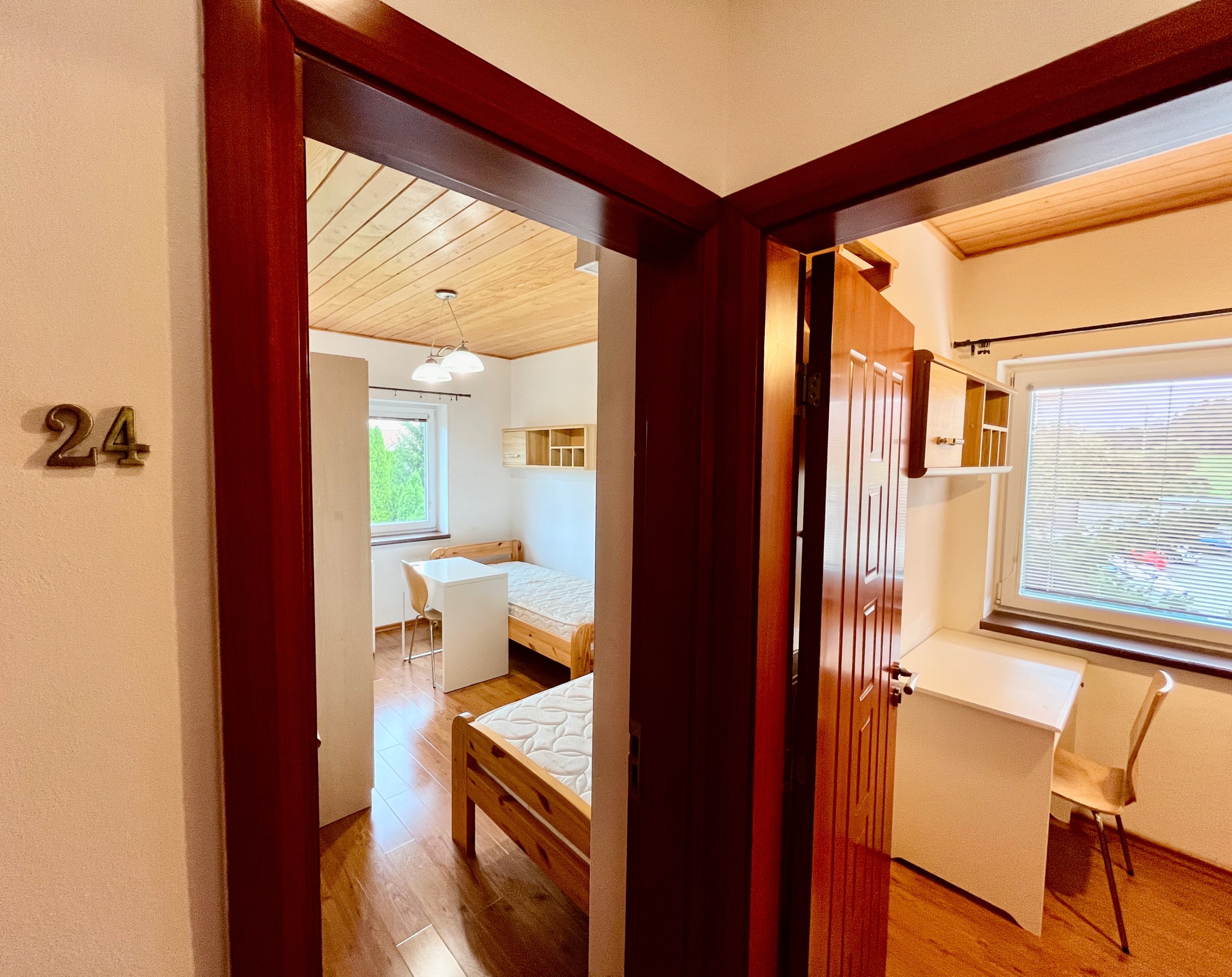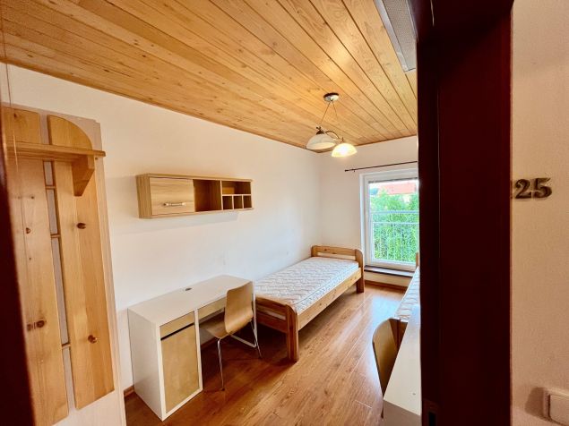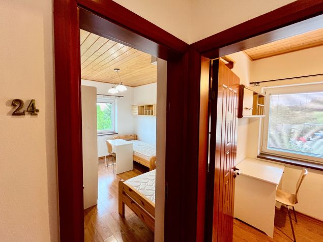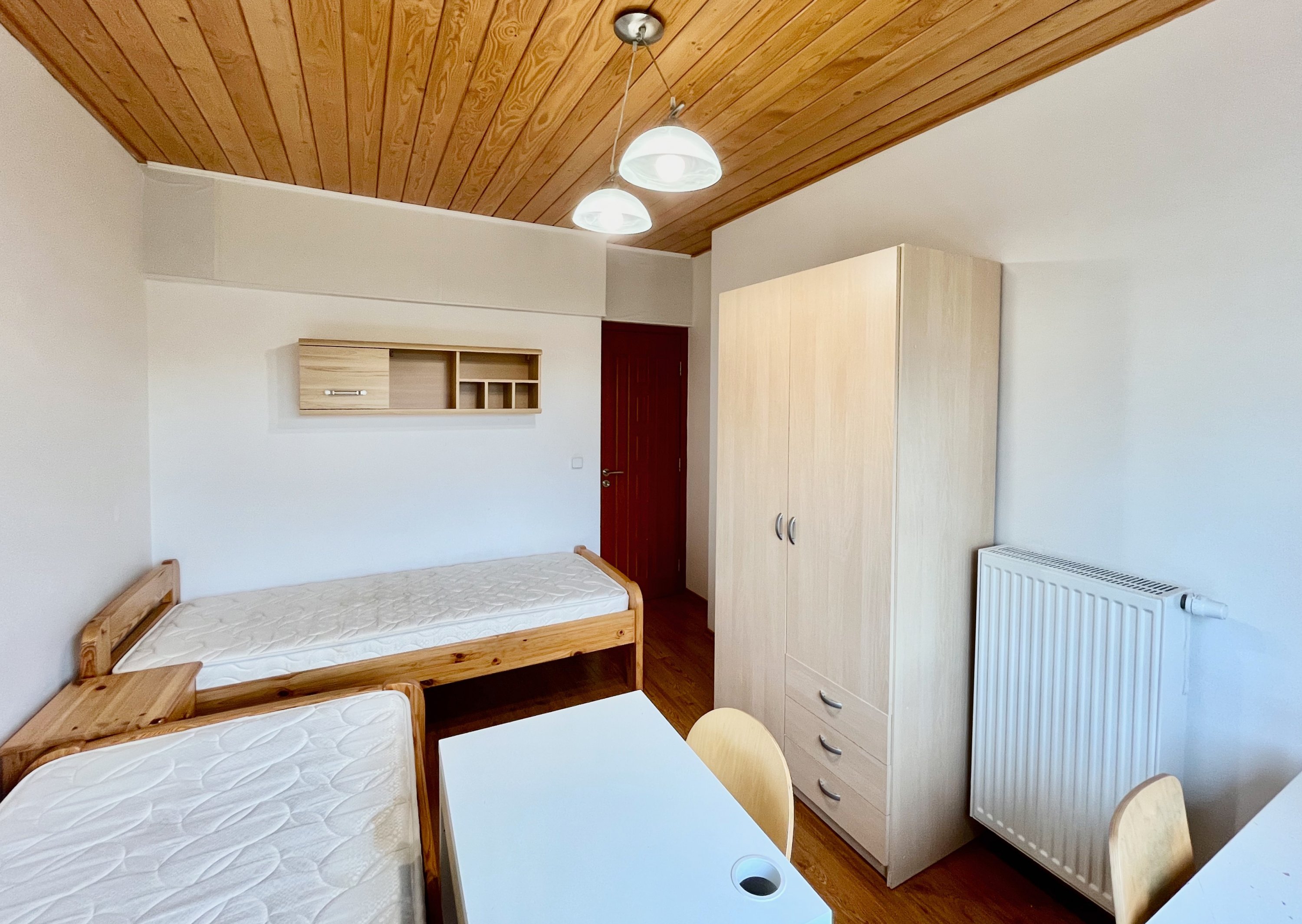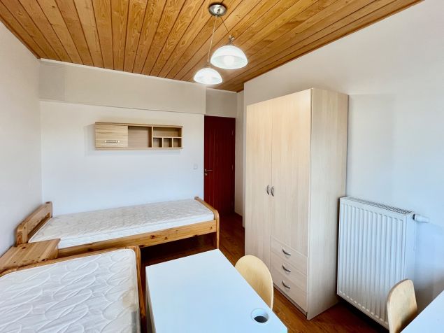 Pokoje jsou plně vybavené (postel, skříň, psací stůl, nástěnná polička) a speciálně odhlučněné pro