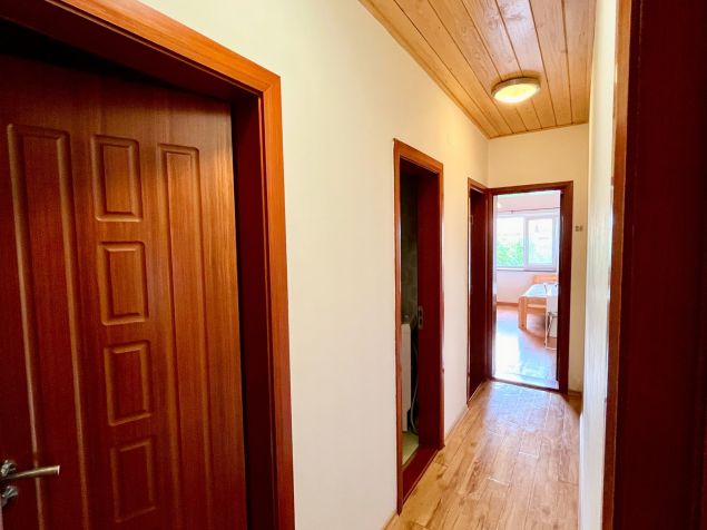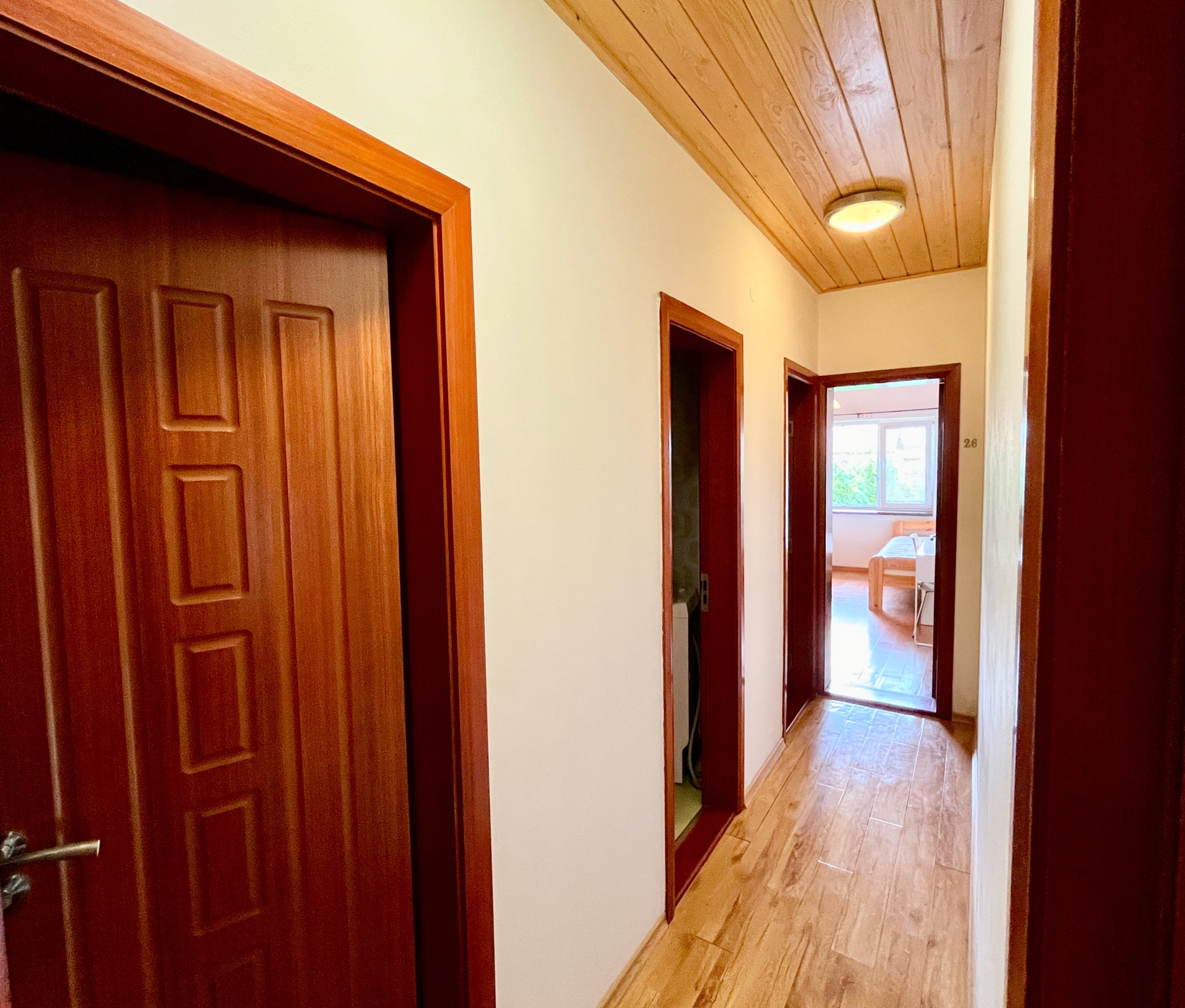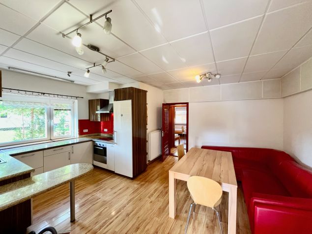 Společnými prostory jsou 2 koupelny, 3 WC a kuchyň s obývacím pokojem a koženou sedací soupravou. Součástí domu je i zahrádka s posezením a malé parkoviště.