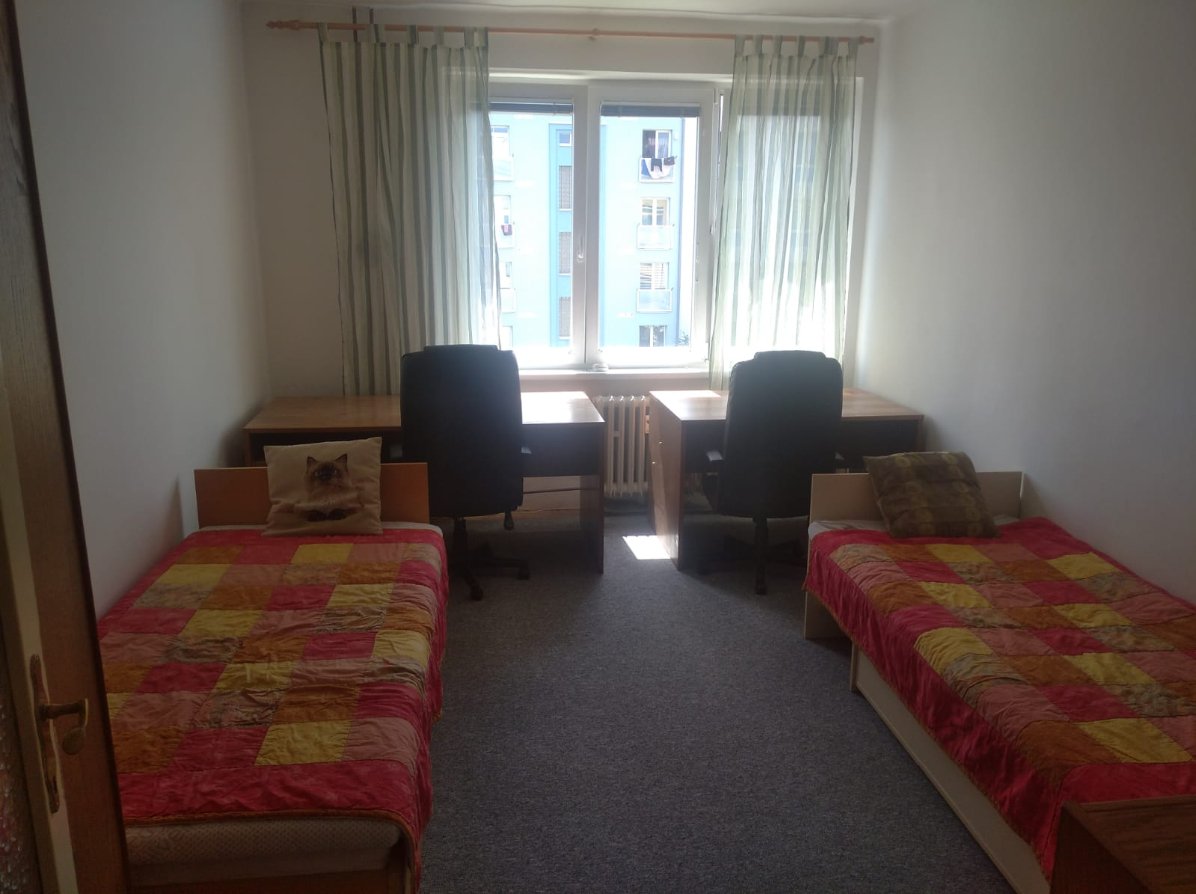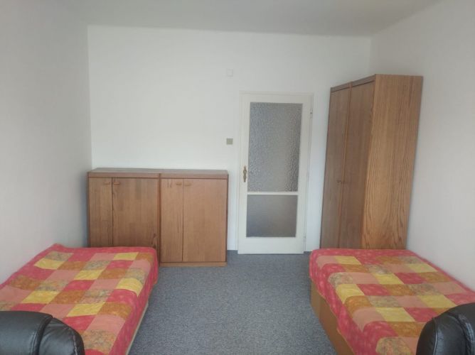 V pokoji jsou 2 psací stoly, 2 skříňky, 2 šatní skříně a dvě postele s matracemi.
