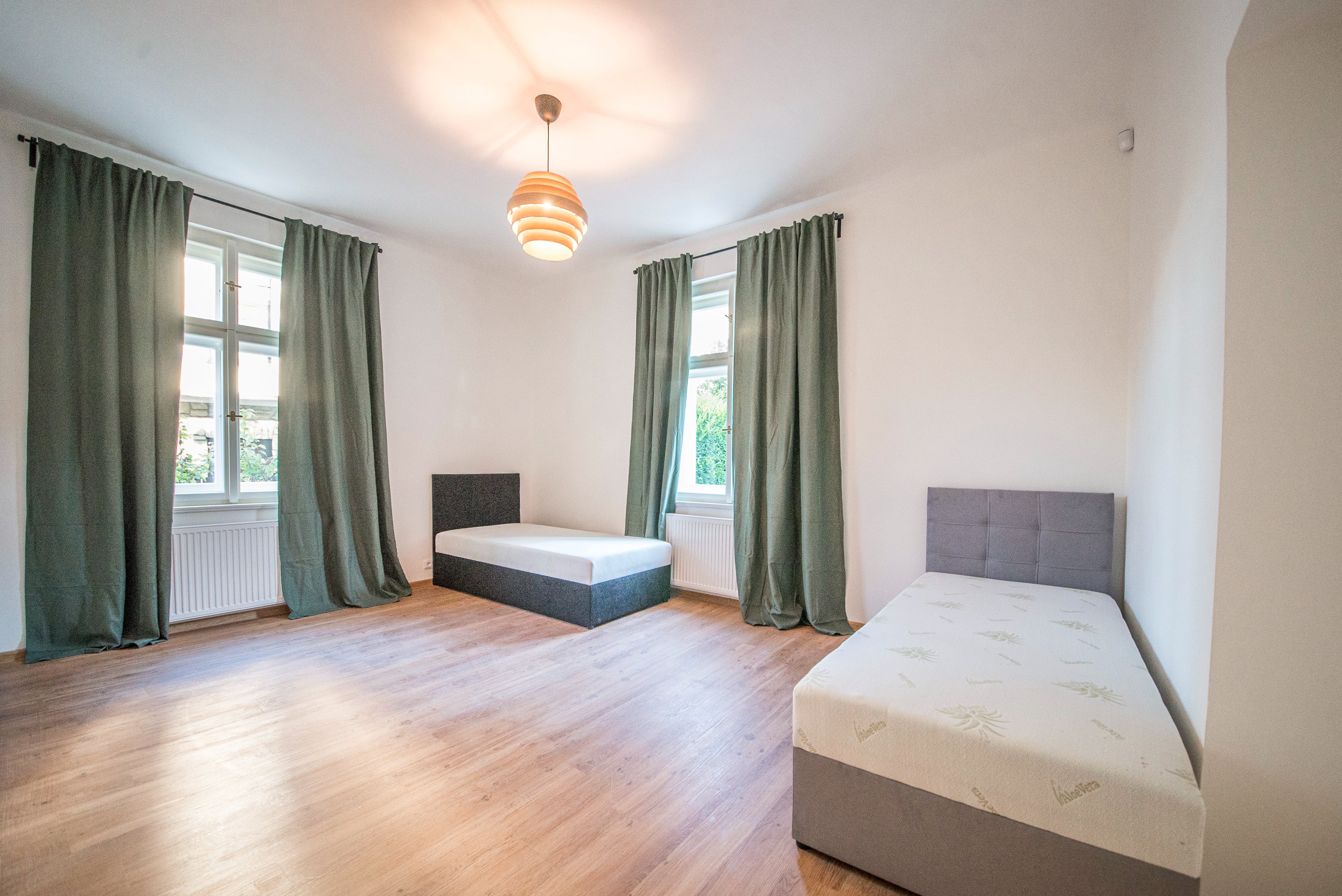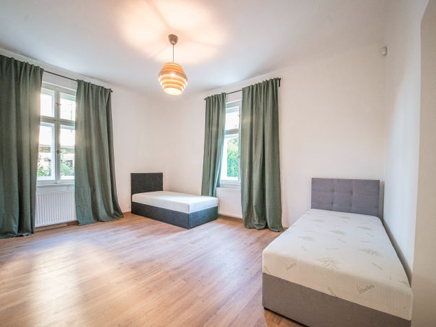 Částečně zařízené pokoje v plně vybavené a kompletně zrekonstruované EDUVILLE. Pokoje jsou určené k bydlení a automaticky získáváte přístup ke všem společným prostorám vily, včetně kuchyní, obývacích pokojů, studovny, prádelny a zahrady.