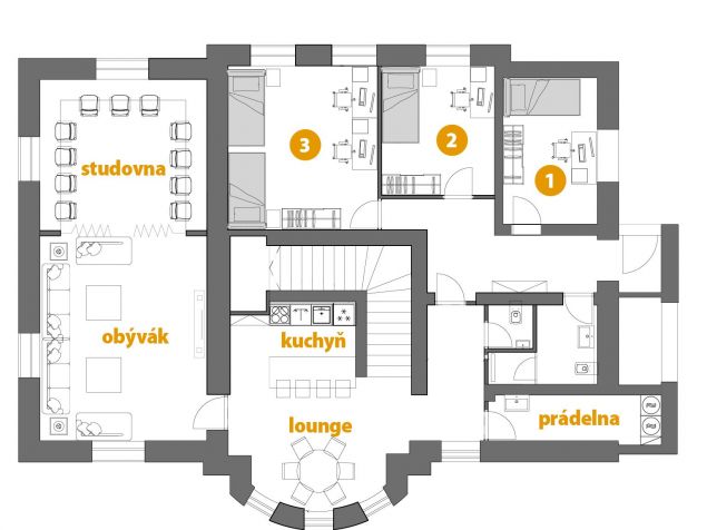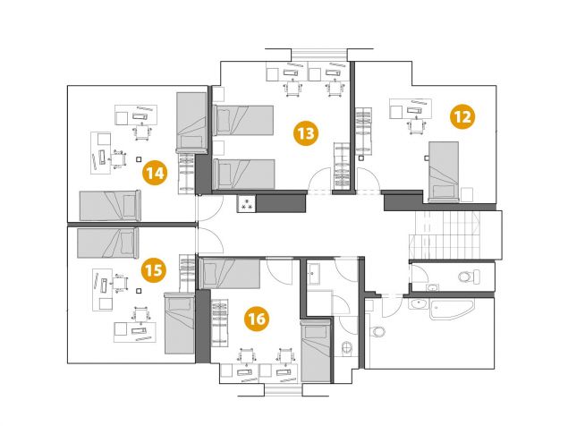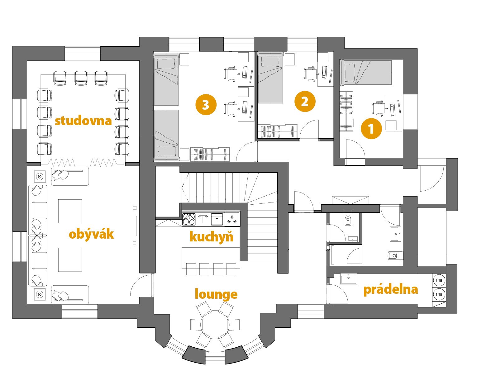 Váš pokoj bude odrážet vaši duši. Jen vy víte, co vás baví a jaké drobnosti vás inspirují. Proto jsme pokoje zařídili jen základním vybavením – postelový rošt, pracovní stůl, závěsy a světlo.