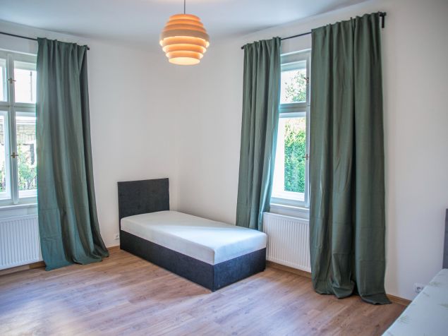 Částečně zařízené pokoje pro dva studenty (kamarády nebo pár) v plně vybavené a kompletně zrekonstruované EDUVILLE. Pokoje jsou určené k bydlení a automaticky získáváte přístup ke všem společným prostorám vily, včetně kuchyní, obývacích pokojů, studovny, prádelny a zahrady.