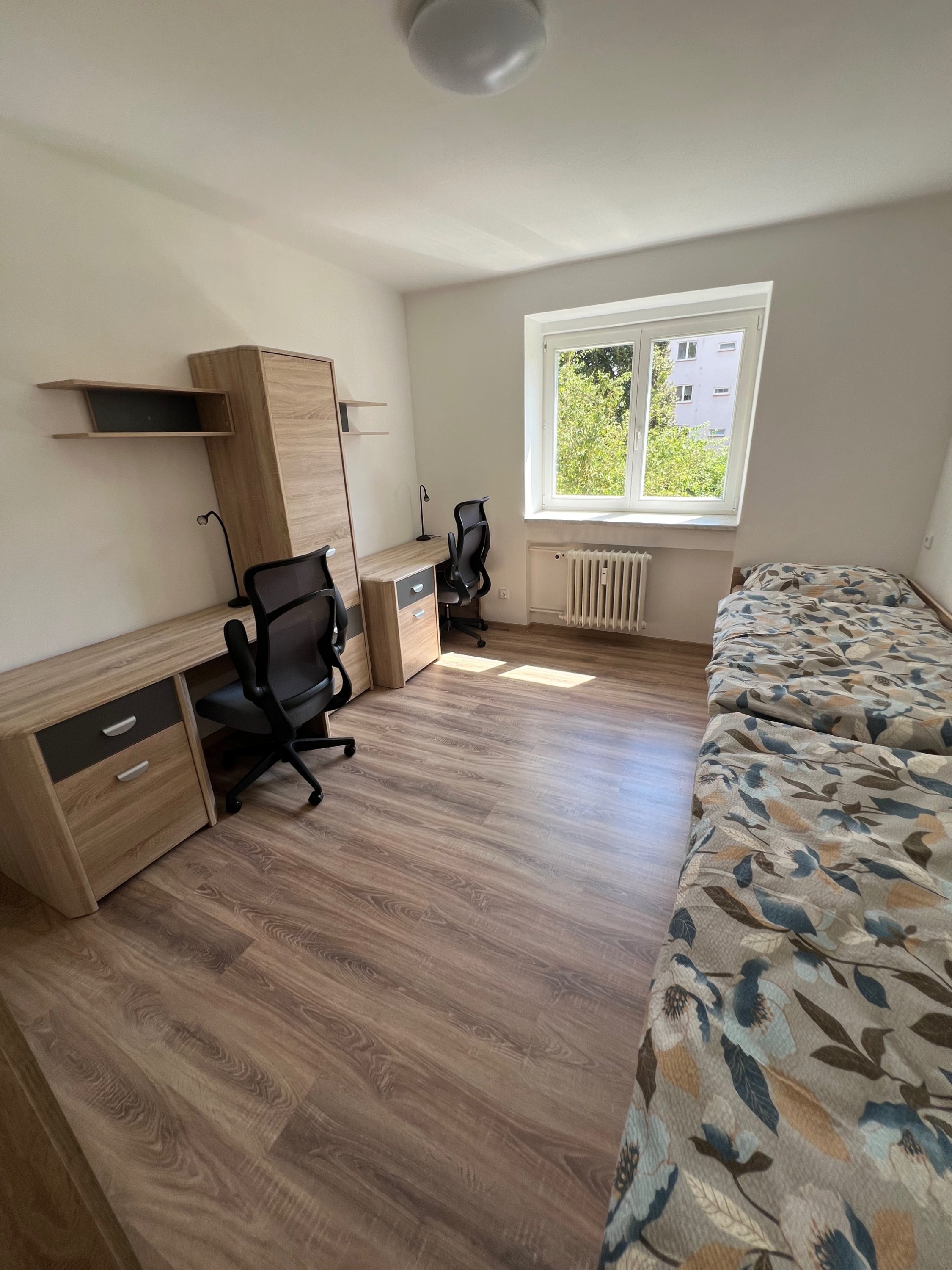 Byt 2+1 je ve zvýšeném přízemí a v roce 2024 byla provedena celková rekonstrukce. Je vybaven pro 4 studenty-ky, v každém pokoji 2 osoby. Kuchyň je vybavena myčkou, mikrovlnou troubou, normální troubou,