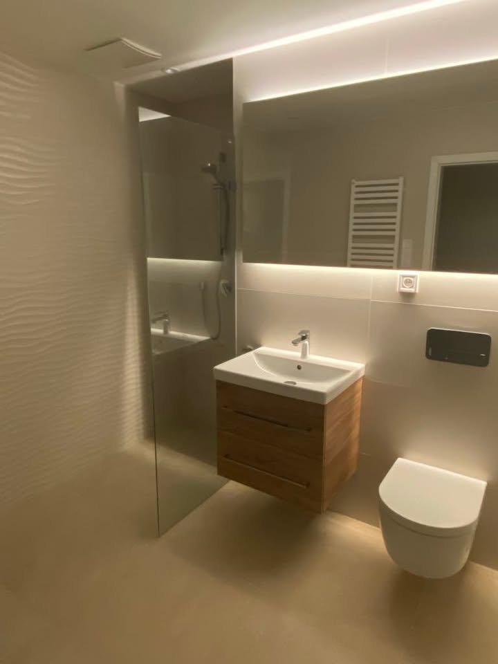 Koupelna s podsvíceným zrcadlem nabízí prostorný sprchový kout, závěsné WC, umyvadlovou skříňku a pračku.