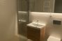 The bathroom, with a backlit mirror, offers a spacious shower.