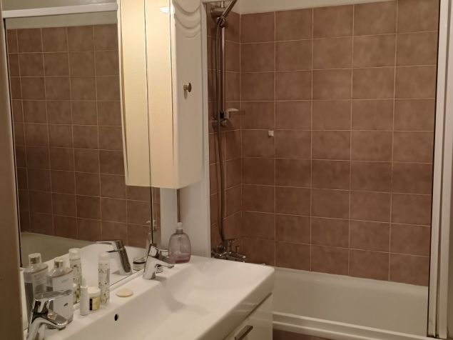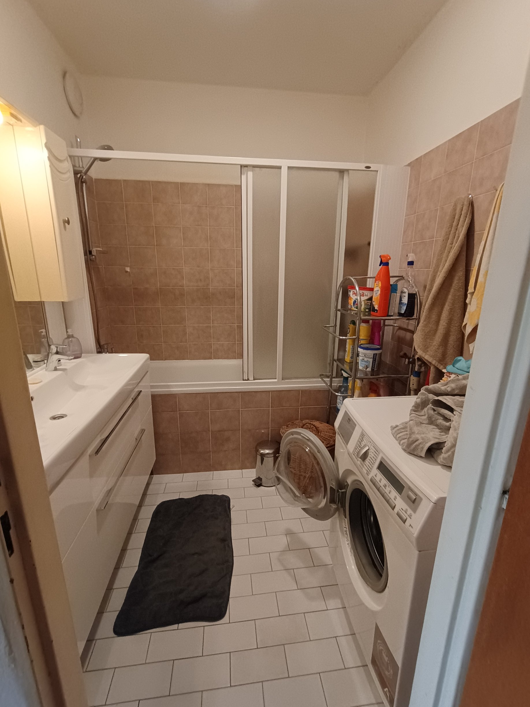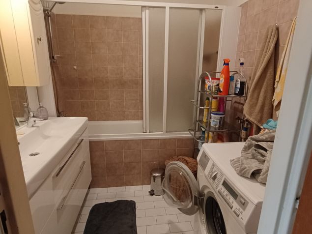 Dále je v bytě, který má celkem 80m2 koupelna s pračkou, samostatný záchod, šatna a kuchyň (lednice s mrazákem, varná deska, trouba). Dále jsou tam dva pokoje s jinými nájemníky. Cena je 11.500 Kč + poplatky (topení, voda, elektřina, internet). Poplatky jsou 3.000,- pro jednu osobu, nebo 4.000,- pro dvě osoby.