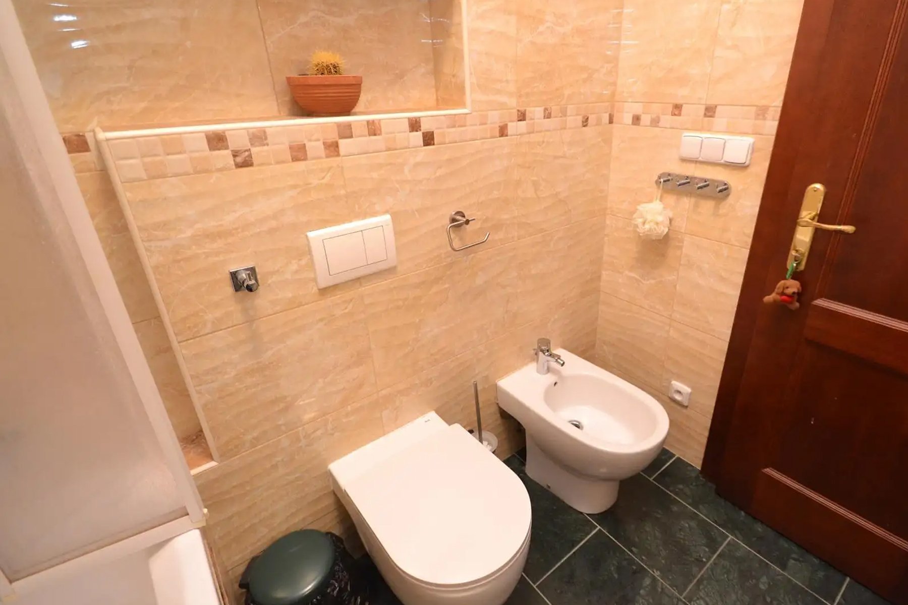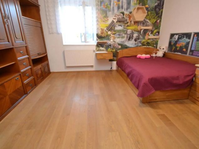 The room is equipped with a wide bed, a row of wardrobes, a desk with drawers and a folding table, heating and air conditioning. On the floor there is a bathroom with toilet and a room with a sink, both shared with the other tenant. In the basement there is a refrigerator, washing machine and dryer, also shared with the other tenant. WiFi and reasonable water and energy consumption (electricity, heat, gas) included in the price. Possibility of renting a parking space.