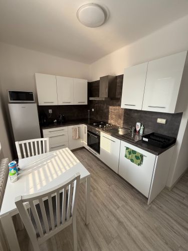 Plně vybavená kuchyň – lednice, sporák, trouba, mikrovlnka a dost místa na všechny zásoby od popcornu po instantní nudle