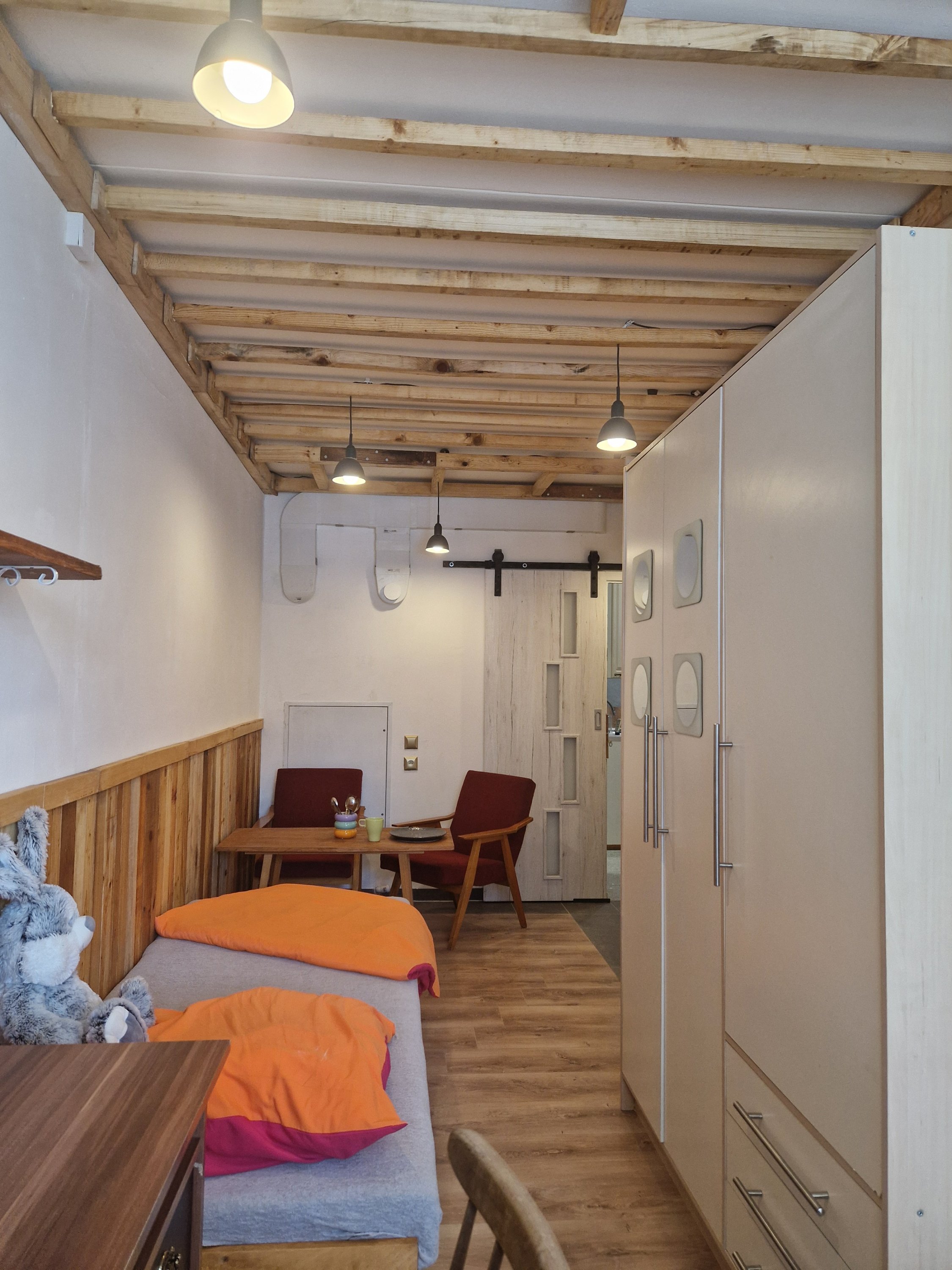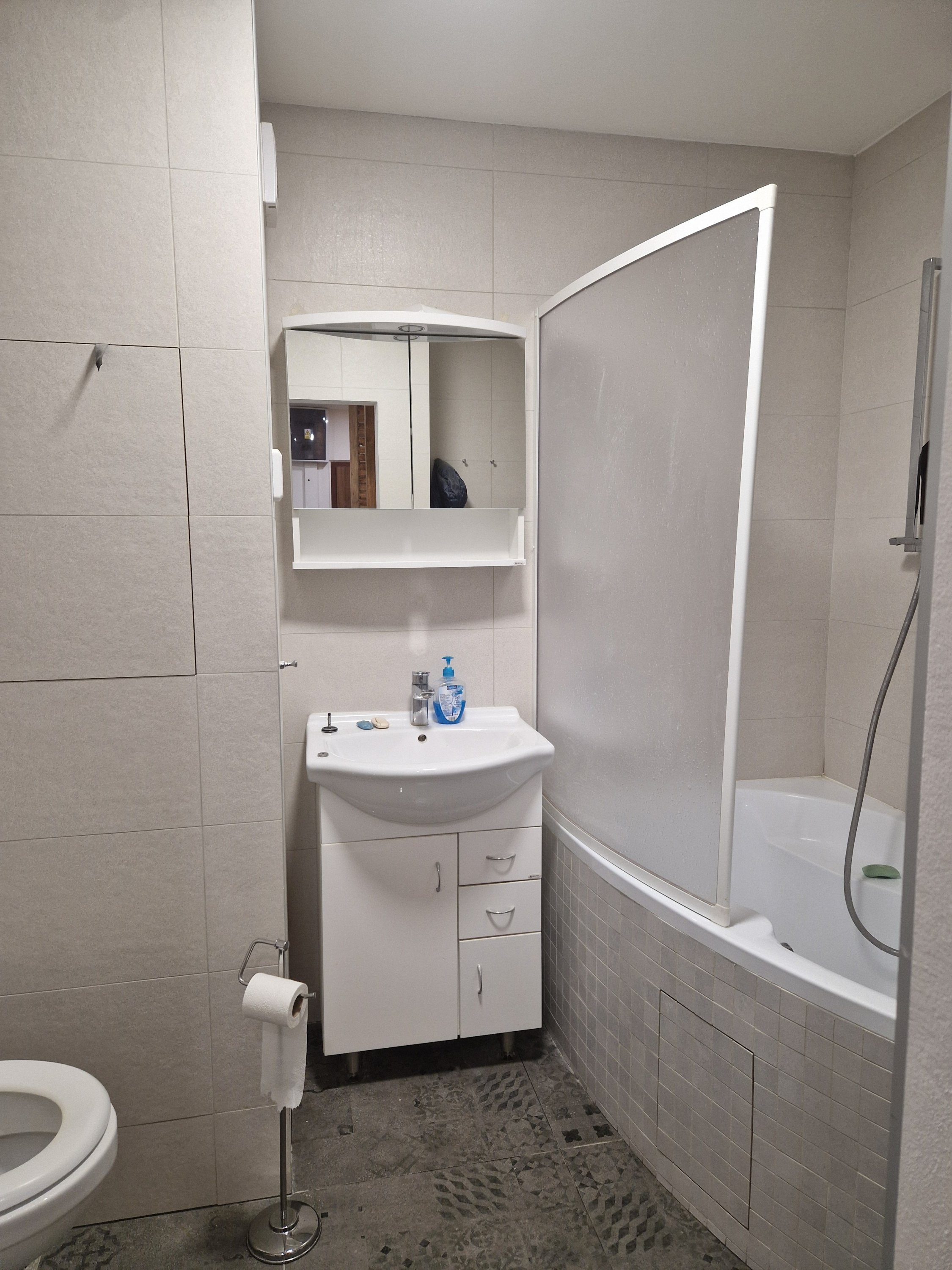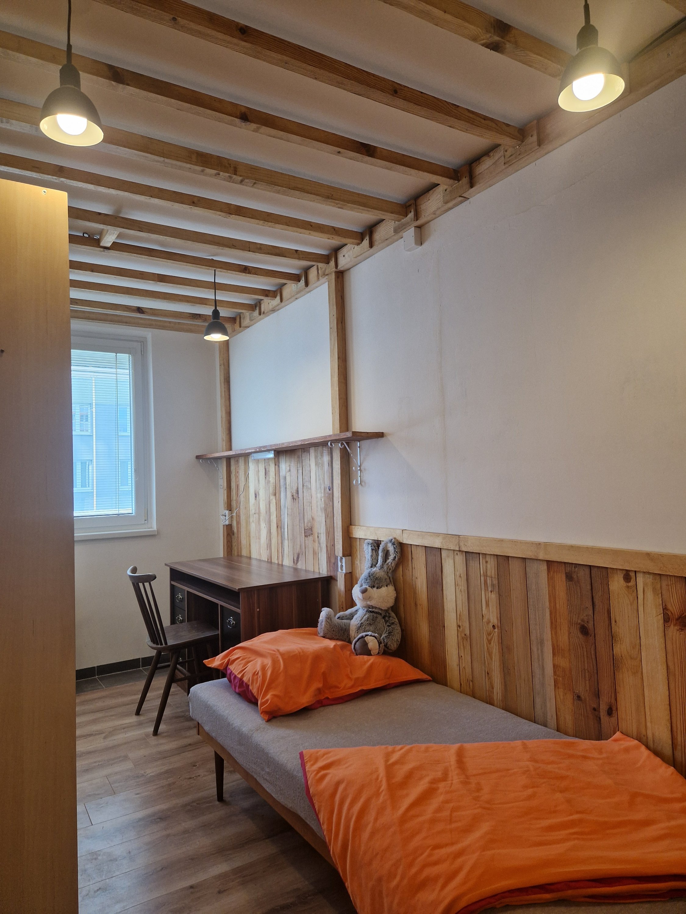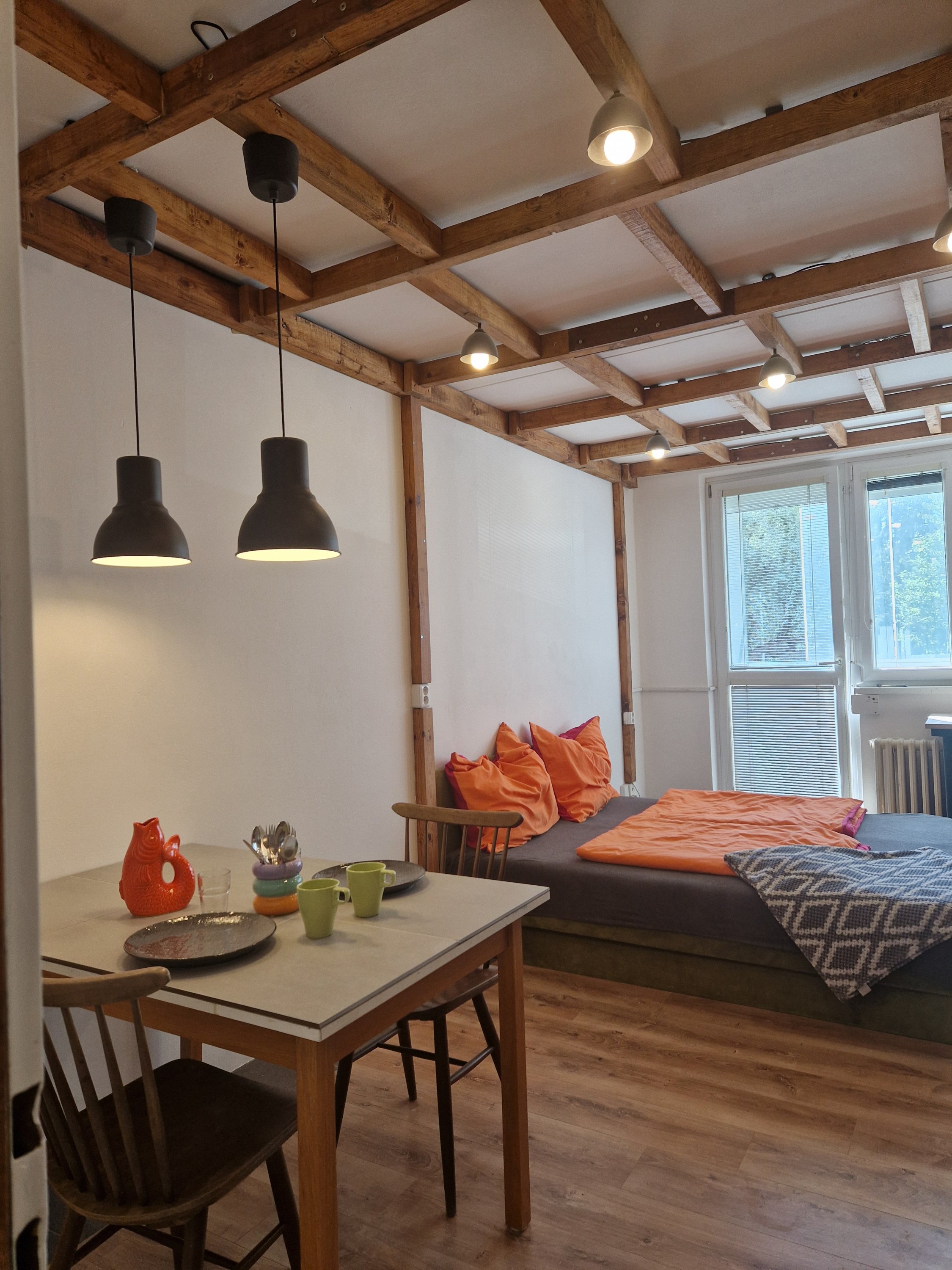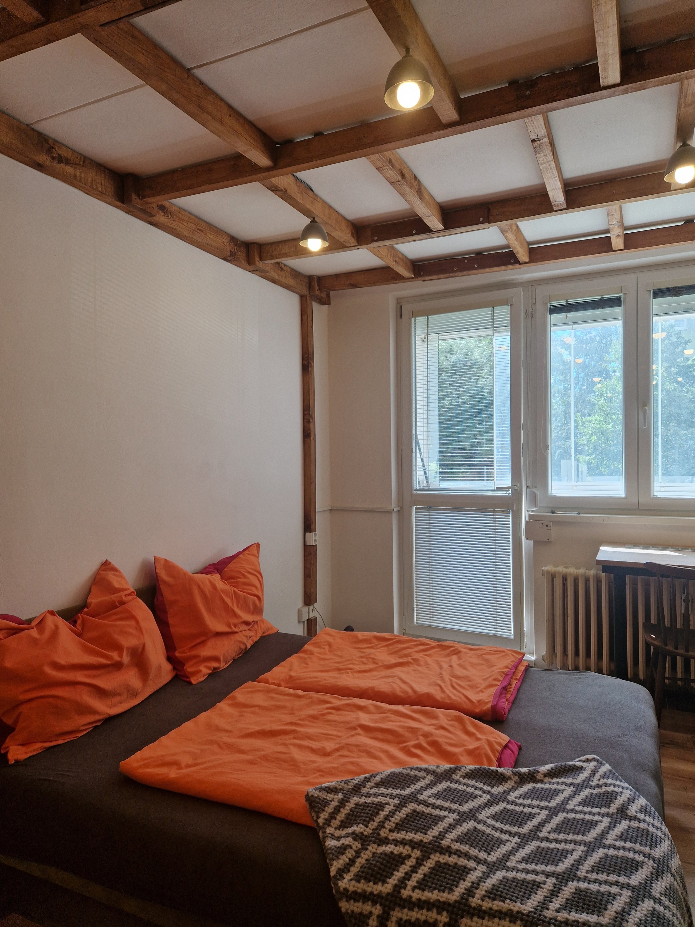 Byt v přízemí obytného domu s bezbarierovým vstupem, zasklenou lodžií, 2 samostatné pokoje z toho jeden pro 2 osoby, druhý pro jednu osobu, samostatně zamykatelné. Po celkové rekonstrukci dokončené letos v srpnu. WC s vanou a sprchou, automatickou pračkou. Kuchyně společná vybavené lednicí, mrazákem, elektrickým sporákem s troubou +mikrovlná trouba a myčka na nádobí. Vybavenou nádobím na vaření i na jídlo. Jihozápadní strana s výhledem do parku, tiché místo. Docházková vzdálenost k tramvaji č. 9,10 a 16 cca 2-3 minuty. Jízdní doba k Andělu 19 minut.