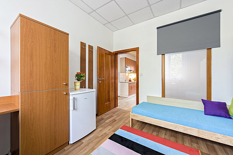 Nabízíme dvoulůžkový pokoj s oddělenými postelemi v objektu Studentských apartmánů v Brně-Komárově. Pokoj je vybavený dvěma lůžky, skříně a poličky pro uložení osobních věcí, lednice pouze pro Vaše potřeby na pokoji. Na patře je společná kuchyňka vybavená mikrovlnnou troubou, indukční varnou deskou a myčkou, v nabídce je základní nádobí na vaření a stolování. Koupelna je vybavena sprchovým koutem a WC + další samostatné WC pro větší soukromí. V přízemí je umístěna pračka pro volné použití všemi nájemníky.