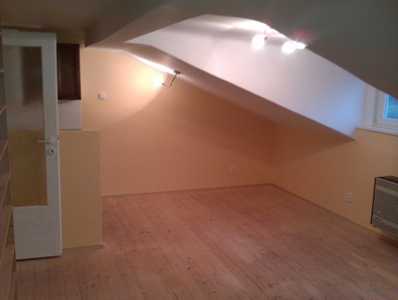 Ateliér v podkroví činžovního domu, orientace do dvora. Po rekonstrukci, zařízeno, výtah. Pokoj s kuchyňským koutem 22,9 m2, předsíň 3,6 m2, koupelna 3,2 (sprchový kout) a WC 0,9 m2. Výborná dopravní dostupnost, tramvaj 5 min., metro Vyšehrad 10 min. Veškerá občanská vybavenost v místě. K nastěhování ihned.