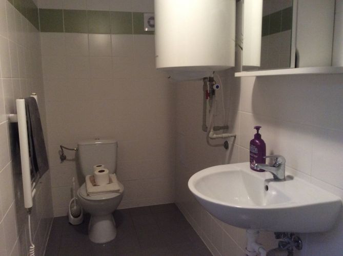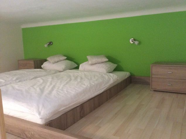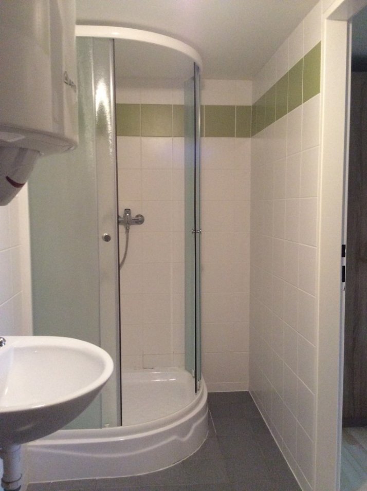 V bytě se kromě vkusného nábytku samozřejmě nachází sporák a chladnička, noční lampičky. Prádelna i se sušičkami na prádlo je společná.