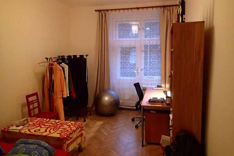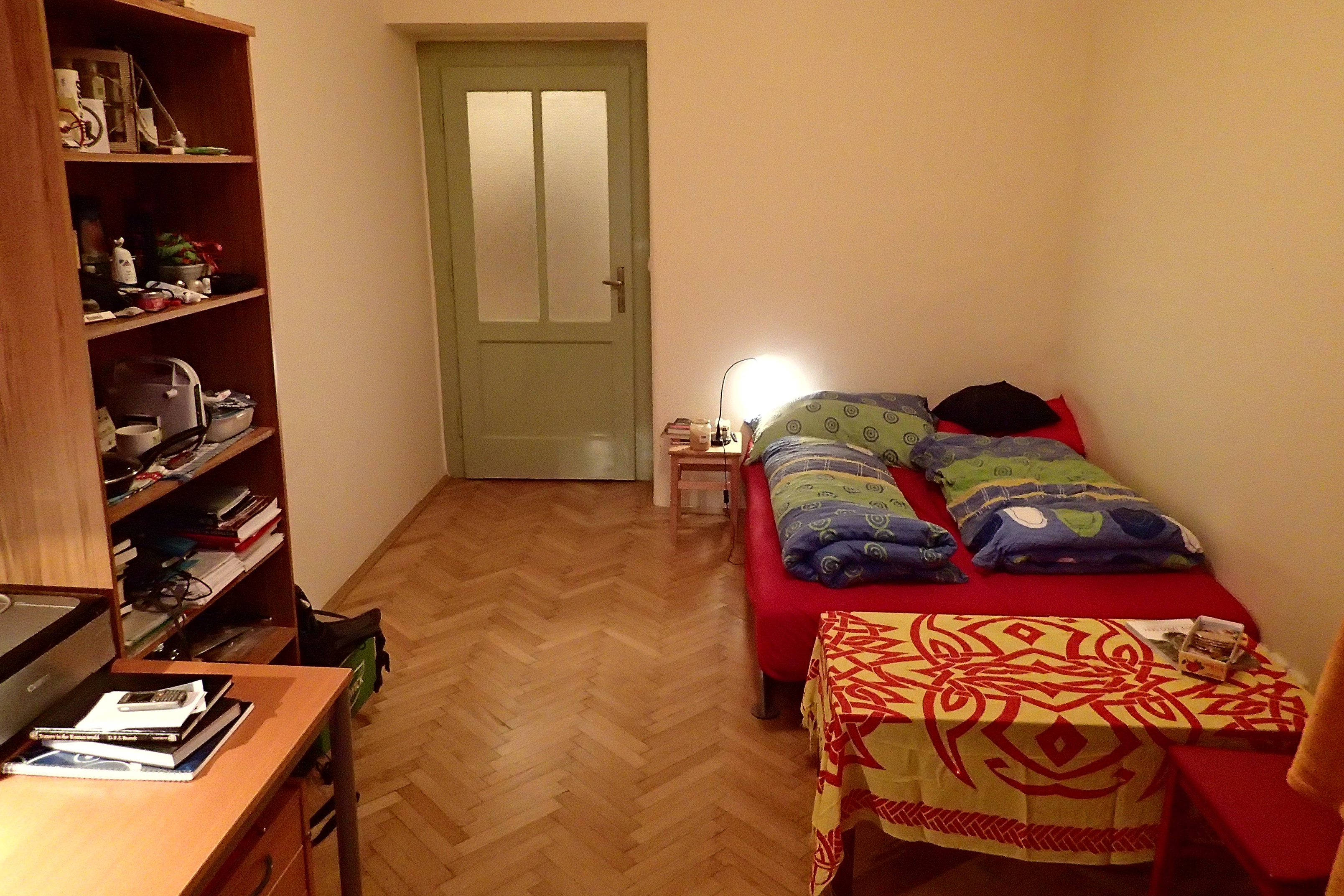 Během pobytu v zahraniční nabízím svůj pokoj k pronájmu. Jedná se o slunečný prostorný pokoj v druhém patře plně zařízený - dvojpostel, velký pracovní stůl, otevřené skříně, poličky, dva menší stolečky, dvě lampičky, přímí přístup na terasu přlibližně 1 x 2 m velkou (lze tam vysedávat a popíjet, větrat peřiny atd.).