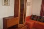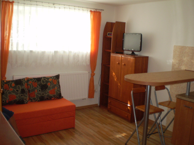 Obývací část: rozkládací gauč, TV a nábytková stěna