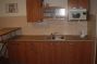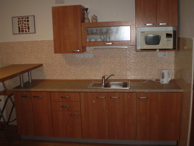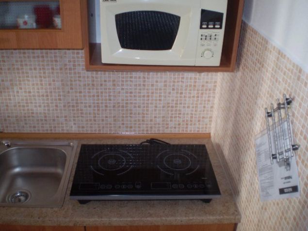 Kuchyňský kout: indukční dvouplotýnkový vařič, lednice, mikrovlnná trouba, rychlovarná konvice a základní nádobí