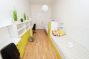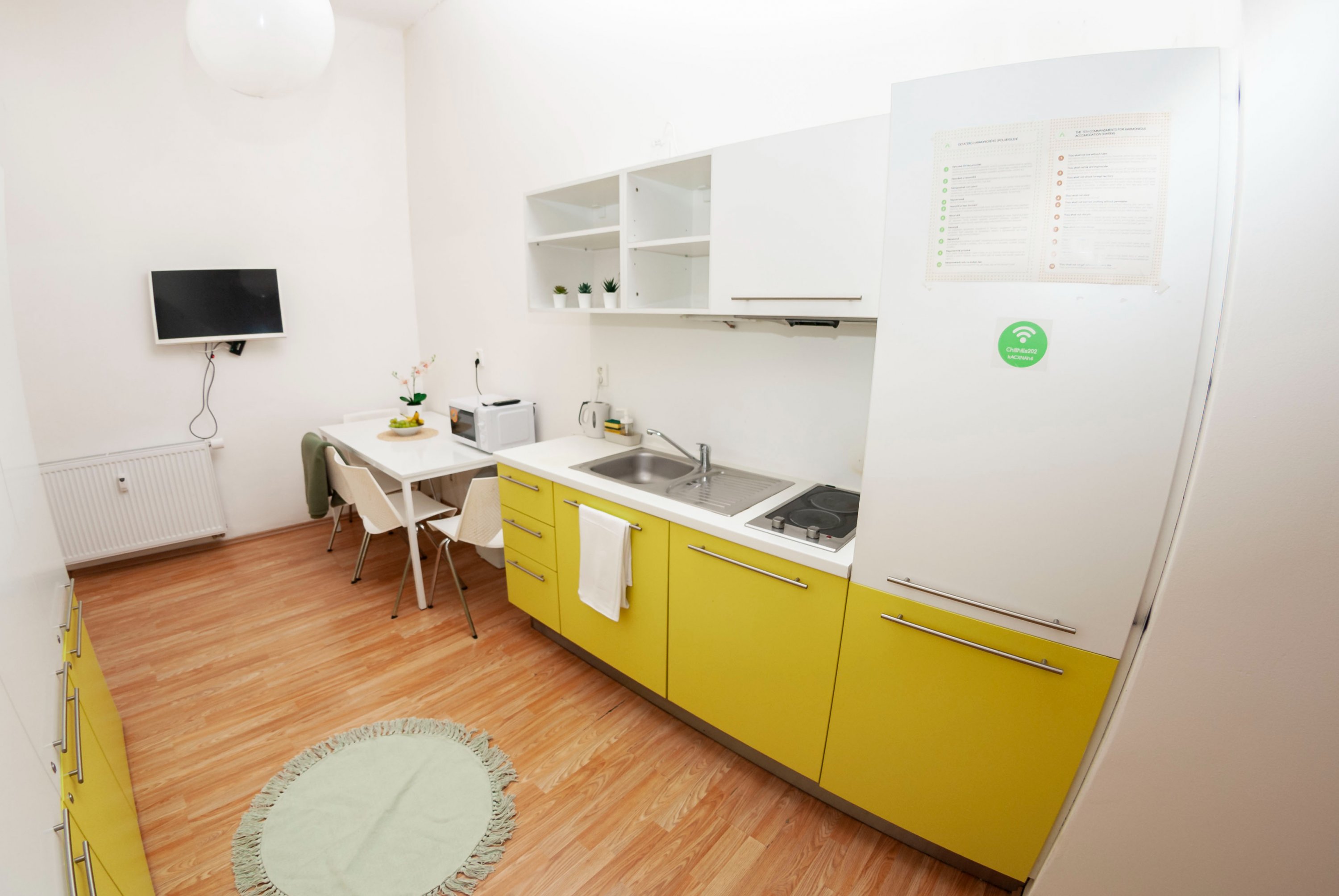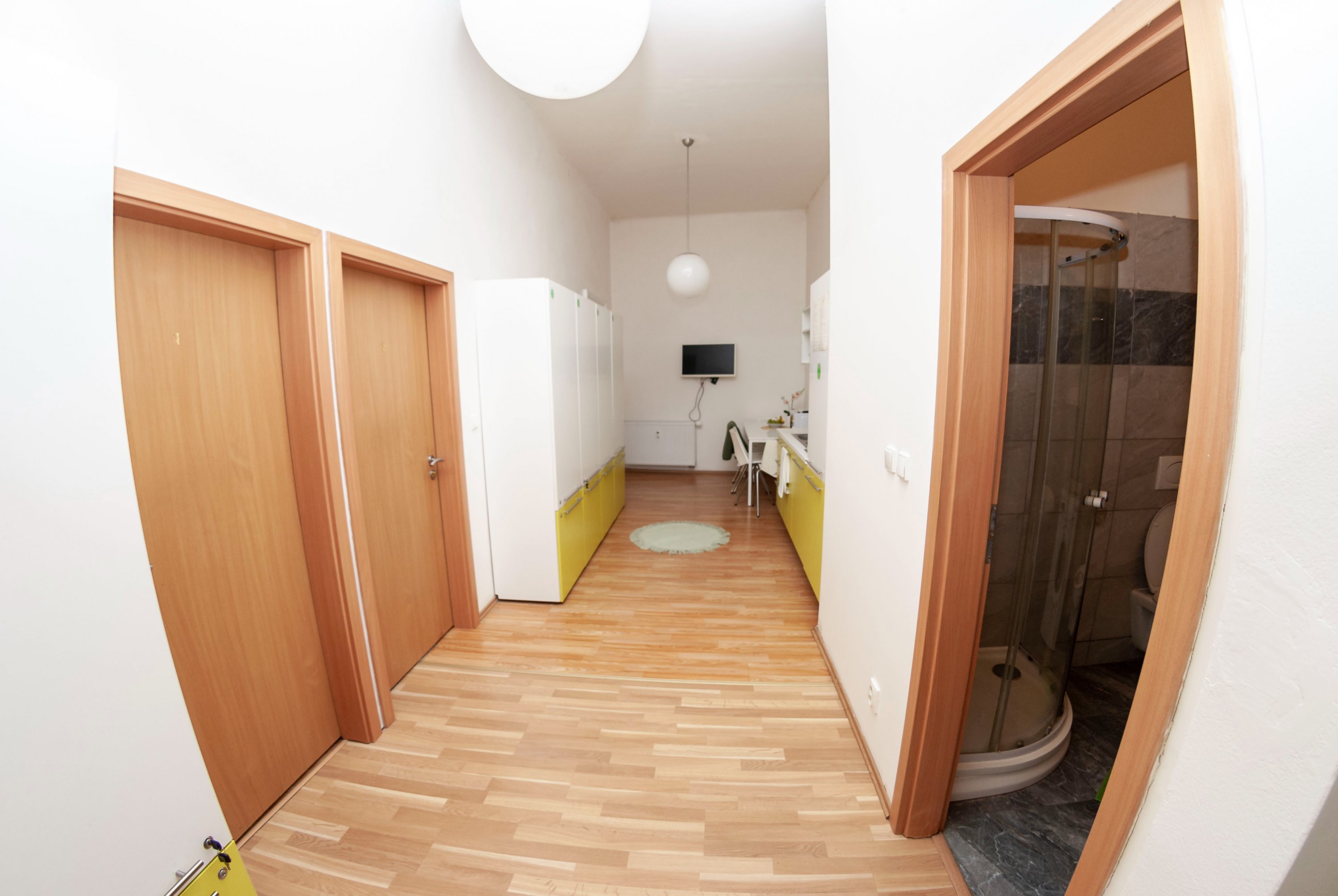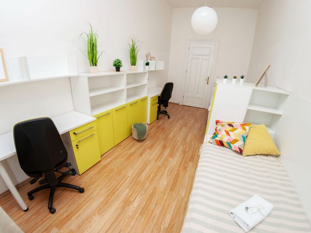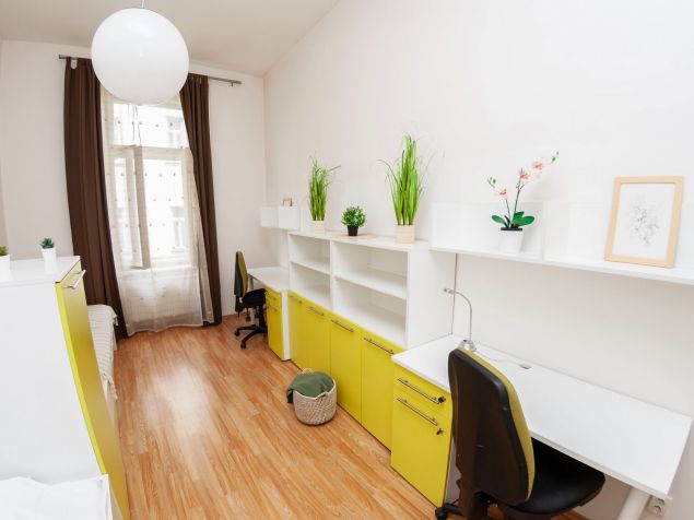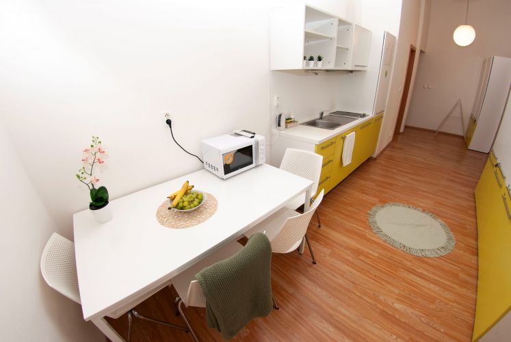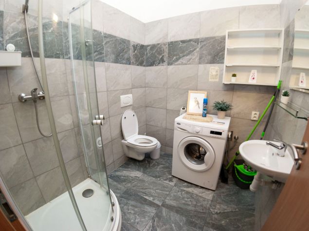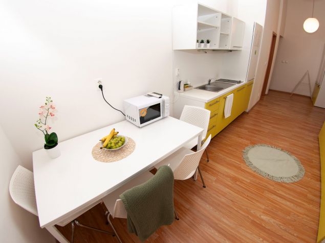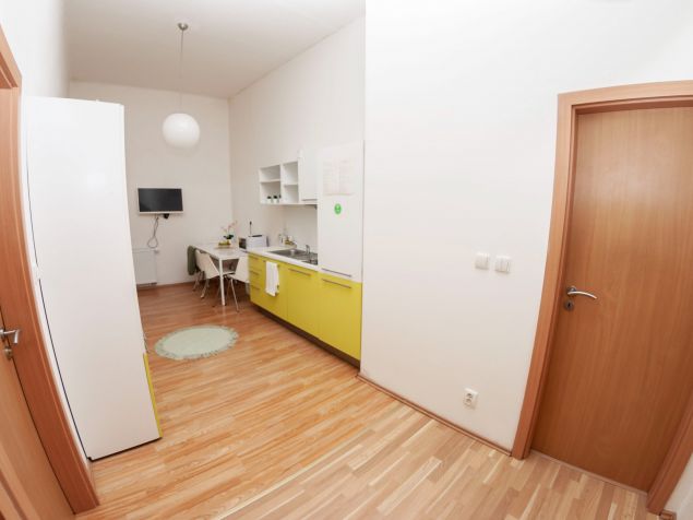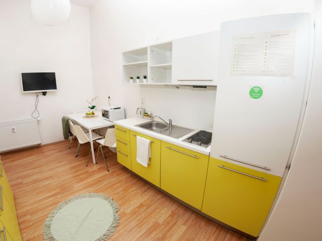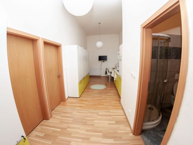 The apartment is fully furnished, there is a kitchen with refrigerator, microwave, LCD TV, washing machine. Marble bathroom with shower. The room has custom furniture - table, chairs, lockers, beds and sunny views of Kozi and Dvorakova streets.