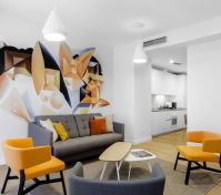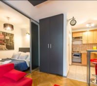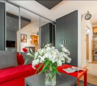 Hlavní část kombinuje obývací prostor s dobře vybaveným kuchyňským koutem. Ložnice je uspořádána za velkými posuvnými dveřmi, které vám poskytnou pocit jednoho otevřeného prostoru a soukromí, když to potřebujete. Prostor se vyznačuje teplými barvami, které dodávají pocit… více informací o pronájmu bytu
