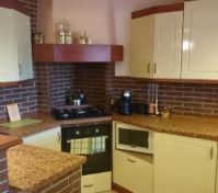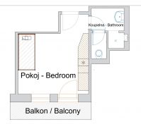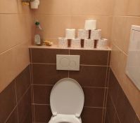 Velmi pěkný půdorys v předsíni, velké kuchyni, ložnici, koupelně s toaletou a komorou.