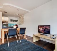 Obývací pokoj s gaučem a jídelním stolem. Ložnice s manželskou postelí. koupelna se sprchovým koutem. Na podlahách parkety, v koupelně dlažba s podlahovým vytápěním. kvalitní kuchyňská linka otevřená do obývacího prostoru opticky oddělená pultem, plně vybavená, digestoř,… více informací o pronájmu bytu